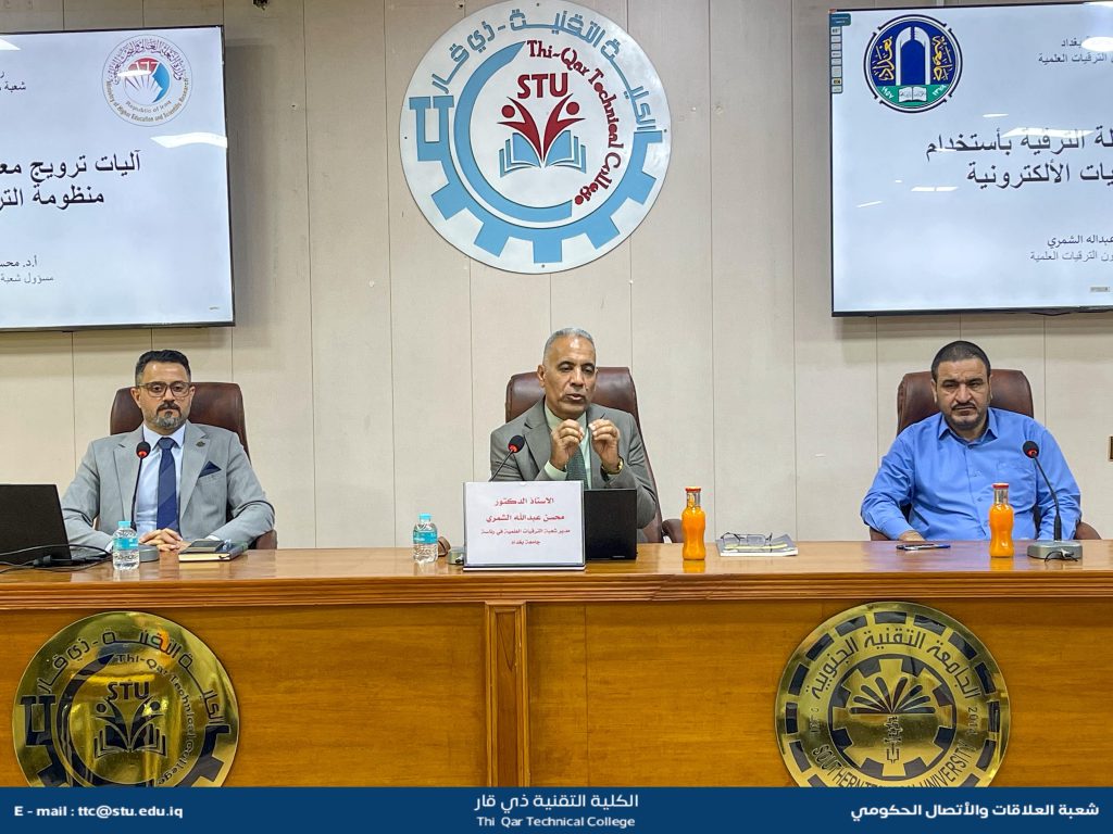 الكلية التقنية ذي قار تقيم ورشة عمل حول “منظومة الترقيات العلمية الإلكترونية في الجامعات العراقية”