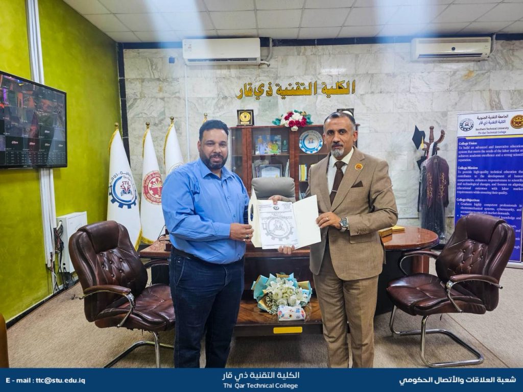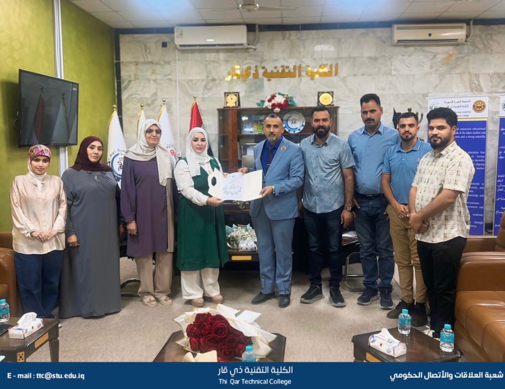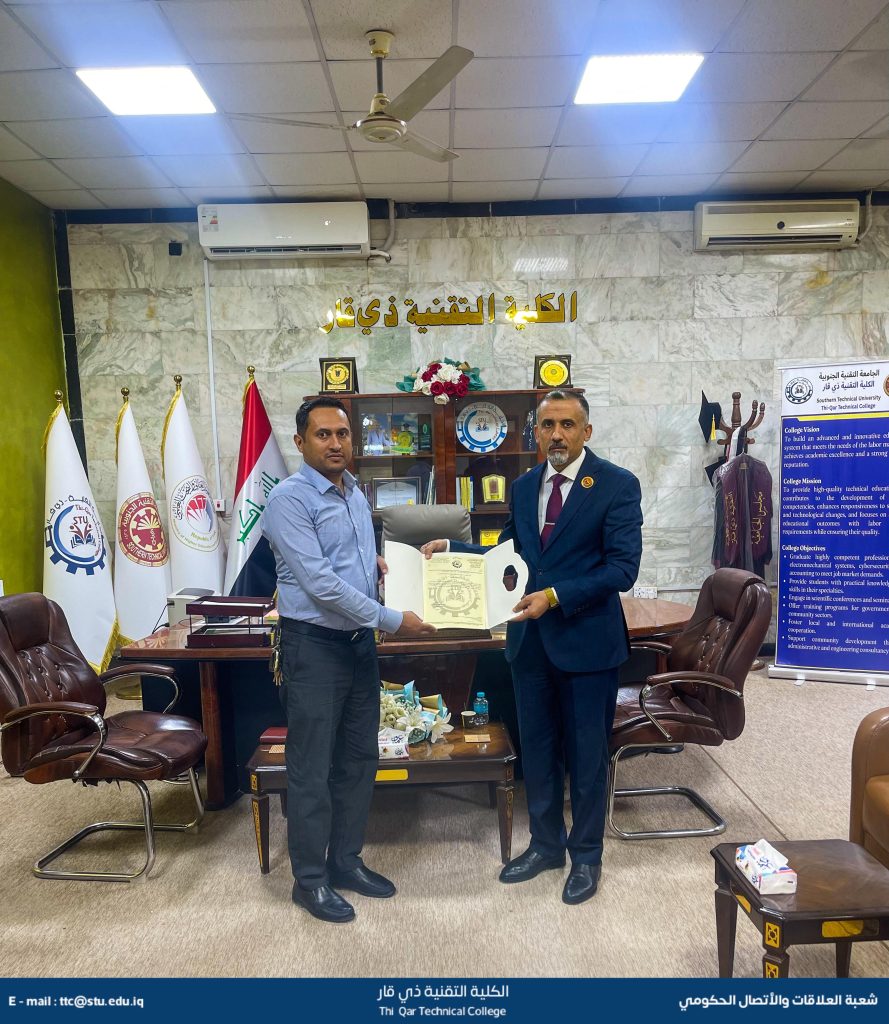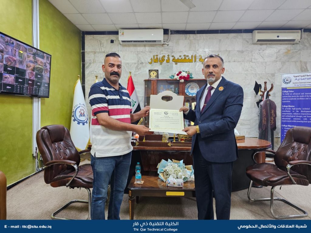 عميد الكلية التقنية ذي قار يكرم شعبة الشؤون المالية بكتاب شكر وتقدير