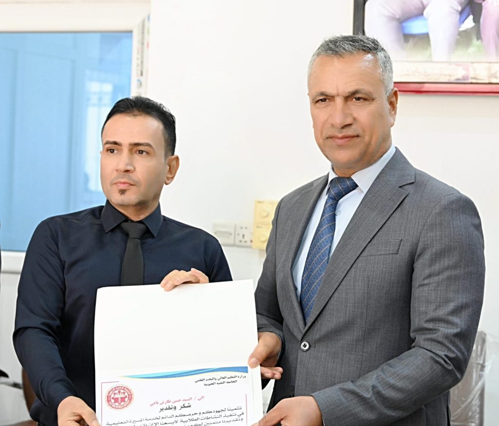 رئيس الجامعة التقنية الجنوبية يكرم مسؤول شعبة النشاطات الطلابية في الكلية التقنية ذي قار لجهوده